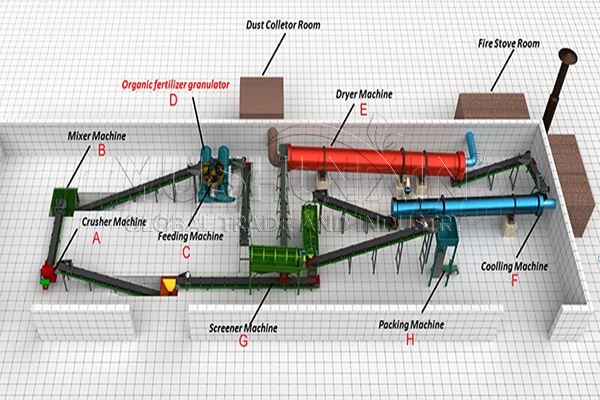 A streamlined material path is crucial. Raw materials should move in a single forward direction: receiving → composting → crushing/mixing → granulation or screening → packaging. Minimizing backtracking reduces labor intensity and prevents cross-contamination. At the same time, designing a clear walkway for workers improves safety and daily operation efficiency.